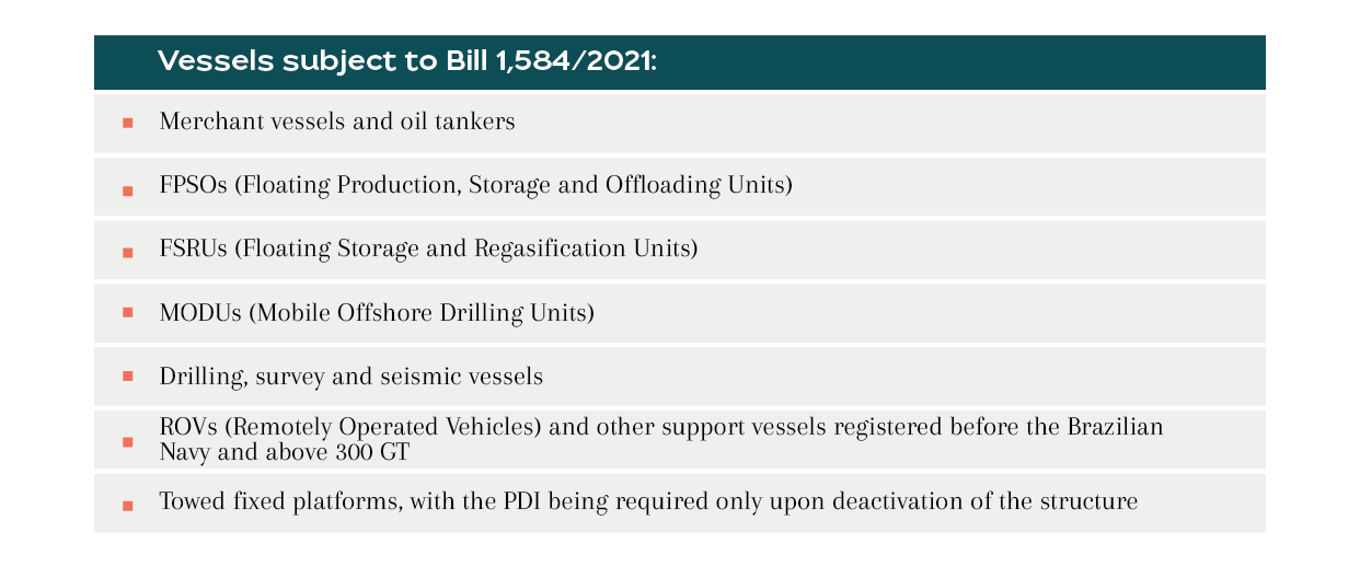 Note that the Article 4 of the Bill 1,584/2021 covers seismic vessels, FPSOs, FSRUs and towed fixed platforms[5]. All of these units have a high investment value, require significant maintenance and operating costs, and involve large structures and high technical complexity.