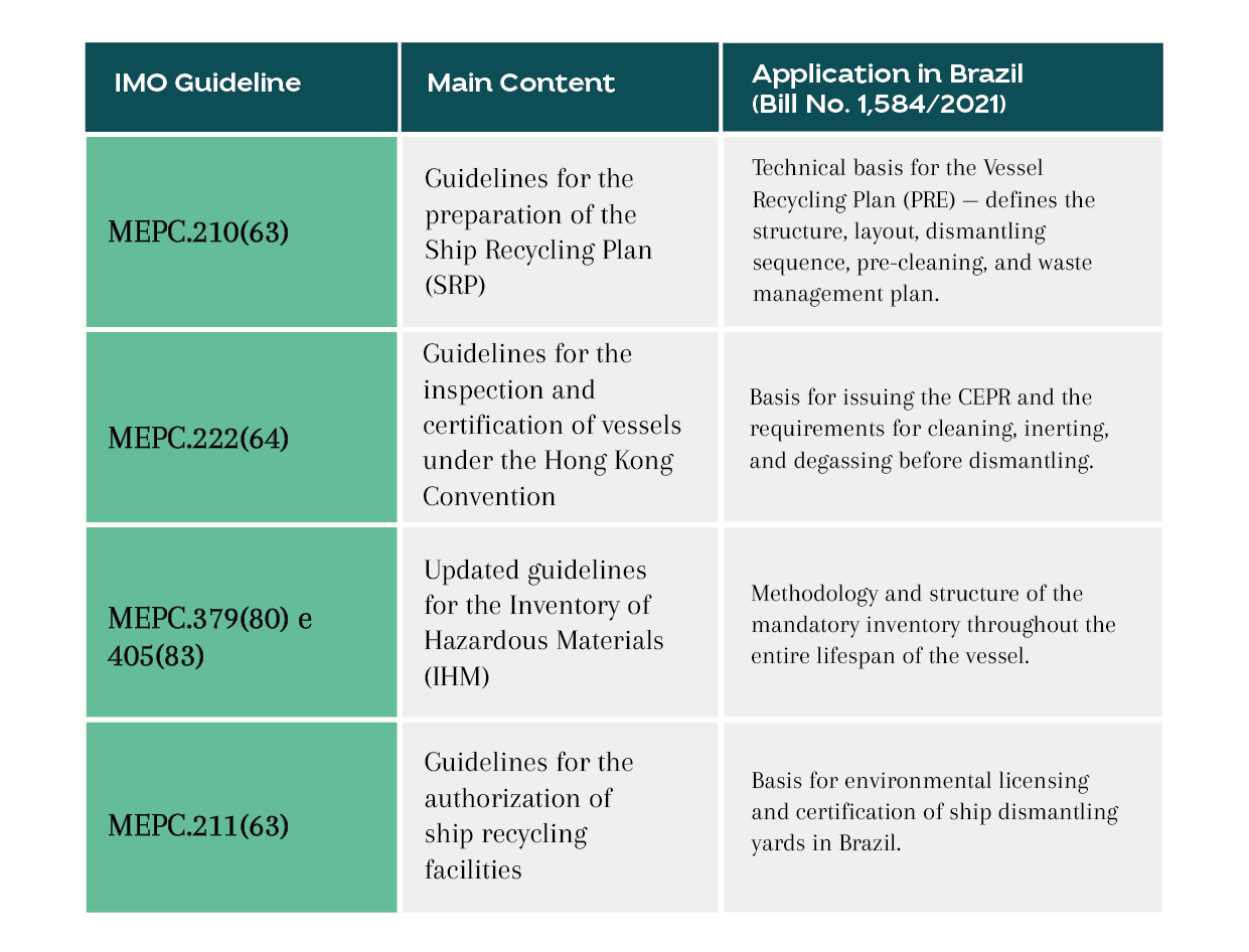 Although Bill 1,584/2021 does not explicitly mention each IMO Marine Environment Protection Committee (“MEPC”) resolution, it mandates compliance with IMO guidelines as minimum technical standards. This means that the procedures stipulated in resolutions MEPC.210(63) (structure of the recycling plan) and MEPC.222(64) (inspection, cleaning and prior inerting) become binding references for IBAMA and the Brazilian Navy in the approval of the PRE and the issuance of the CEPR.